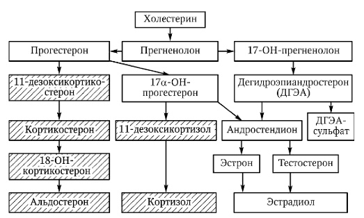 Гиперплазия надпочечников вызывает активную секрецию не только прогестерона и 17-гидроксипрогестерона, то есть стероидных гормонов, предшествующих ферментной блокаде, но и андрогенов, которые синтезируются независимо от фермента 21-гидроксилазы.