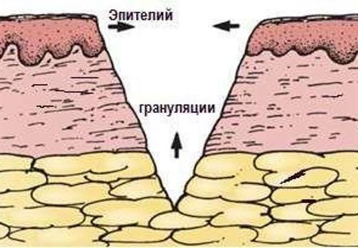 - Грануляция — через 5-6 дней с момента образования раны активируется механизм грануляции, благодаря которому образуются новые эпителиальные клетки. Этот процесс занимает не менее месяца, после чего рана покрывается рубцовой тканью.