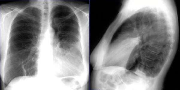 По мере прогрессирования патологии на рентгенограмме грудной клетки видна инфильтративная тень с нечеткими контурами.