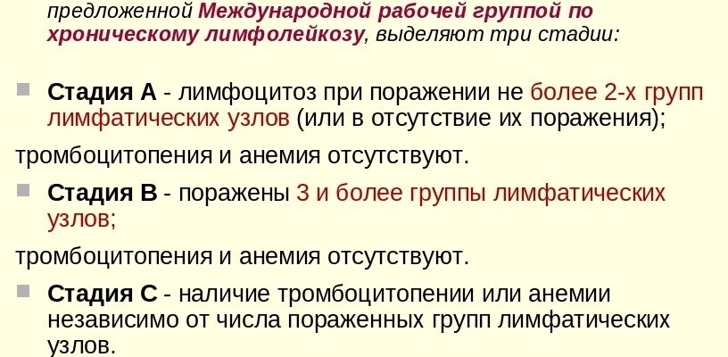 Для этого вида лимфолейкоза в зависимости от симптомов характерны следующие стадии: