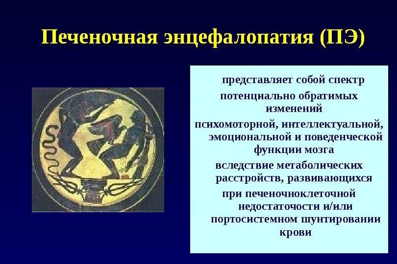 - Энцефалопатия — это сложная нейропсихиатрическая портосистемовка, в которой смещение портосистемовегого до достижения мозговых веществ, которые в нормальных условиях нейтрализуются печенью.