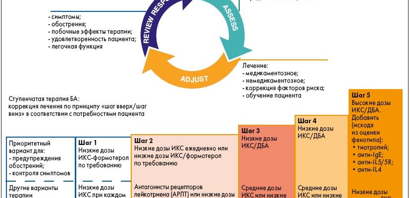 Согласно этому документу, основная цель лечения — достижение и поддержание контроля над астмой. Для этого следует использовать минимальное количество препаратов.