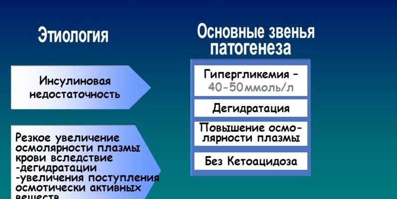 Основные факторы, которые вызывают развитие этого вида диабетической комы является нарушением водно-электролитного организма (обезвоживание) и одновременного возникновения дефицита инсулина. В результате, уровень глюкозы в крови увеличивается пациента.