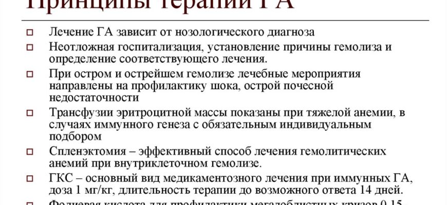 Различные формы ГА имеют свои особенности и методы лечения. При всех вариантах приобретенной гемолитической анемии следует стремиться к устранению влияния гемолитических факторов. При гемолитических кризах больным необходимы инфузии растворов, плазмы крови, витаминотерапия, при необходимости — гормональная и антибактериальная терапия. При микросфероцитозе спленэктомия является единственным эффективным методом, приводящим к 100% разрешению гемолиза.