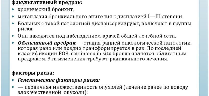 Факторы риска включают состояния, которые могут быть фоном или предрасполагать к развитию рака легких.
