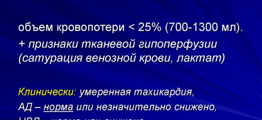 Это субкомпенсированный геморрагический шок, при котором CIC снижается примерно на 18–20 процентов. Снижение артериального и центрального венозного давления, слабость, пятна перед глазами и головокружение, четкая тахикардия — симптомы геморрагического шока второй степени тяжести.