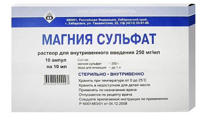 Сульфат магния применяют для понижения артериального давления и в виде белого порошка для раствора в воде, а также в ампулах по 5 или 10 мл для приема.