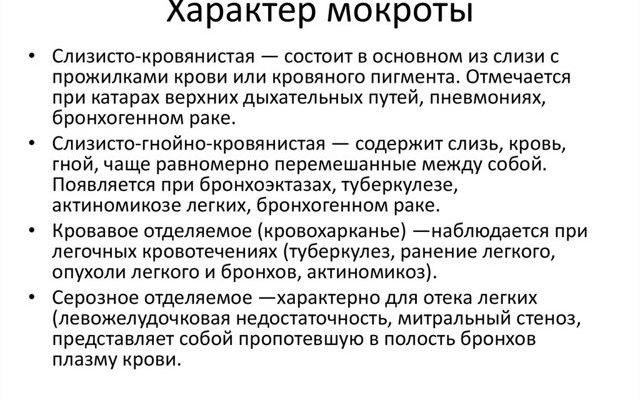 В первом случае оцениваются общие характеристики бронхиального секрета: макроскопические параметры (цвет, запах, консистенция, вид, количество) и микроскопические параметры, наличие специфических включений (спирали Куршмана, эмболы Дитриха, фиброзная коагуляция).