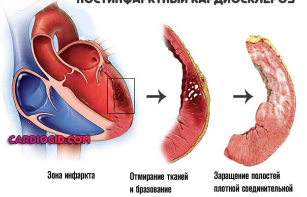 Независимо от причины инфаркта постинфарктный кардиосклероз становится условием для дальнейшего изменения структуры тканей сердца и размеров его полостей, что влечет за собой значительное усиление симптоматики.