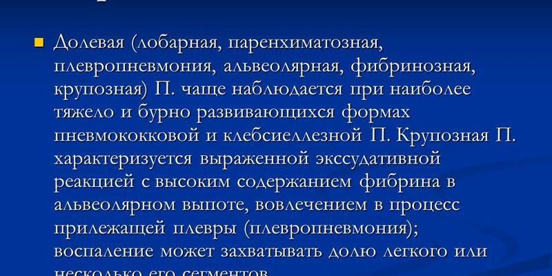 Дольковая пневмония — это заболевание, при котором одна или несколько долей органа утолщены, а в альвеолах имеется патологическая жидкость. Следовательно, легочная ткань перестает активно участвовать в процессах газообмена.