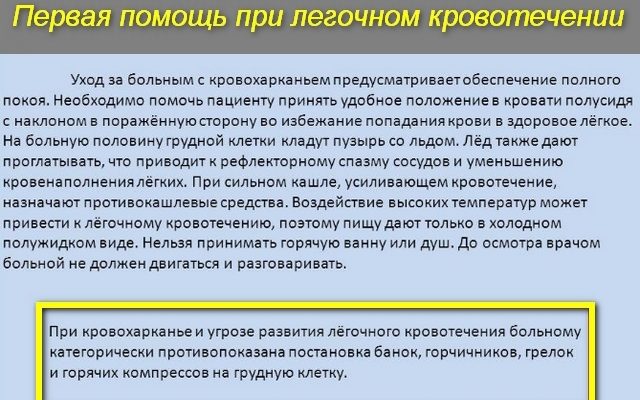 При легочном кровотечении немедленно вызовите скорую помощь. Самостоятельно его не остановить, но можно оказать добольничную помощь в ожидании скорой помощи.