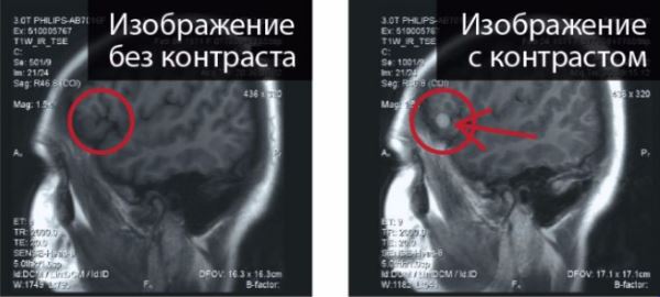 - Сосудистые аномалии и их последствия — обнаруживаются при введении контрастного вещества. В группу риска входят инсульты и инфаркты, на что указывает усиление сигнала в зоне поражения.