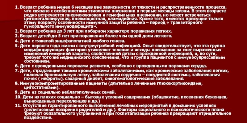 Наиболее подвержены развитию пневмонии маленькие дети. Это связано с тем, что иммунная система растущего организма еще не сформирована, дыхательные мышцы развиты слабо, кашлевой рефлекс выражен слабо. Эти факторы способствуют проникновению, застою и активному развитию инфекции в нижних дыхательных путях ребенка.