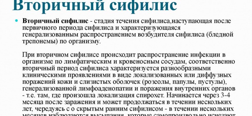 Вторичная стадия сифилиса — одна из самых продолжительных. Течение болезни длится от 2 до 15 лет, в течение которых обострения сменяются бессимптомными периодами. Часто пациенты сами приобретают симптомы вторичного сифилиса, покупая симптоматические препараты в аптеке. Долгое время они не подозревают о наличии в организме патогенного микроорганизма, который тем временем продолжает свою разрушительную работу.