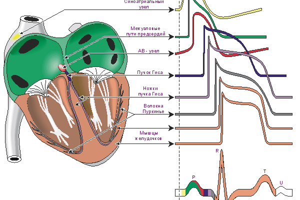 Проводящая система начинается с синоатриального узла, где формируется синусовый ритм, откуда импульсы идут к атриовентрикулярному узлу и попадают в пучок гиса.